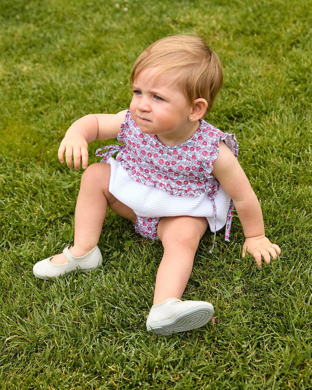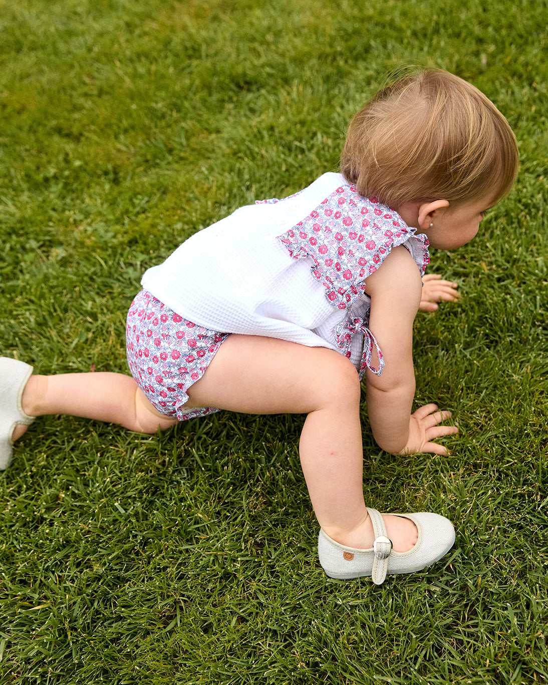 Conjunto bello de camisa con short en tonalidad blanca con flores en tonalidad fuscia en la parte superior