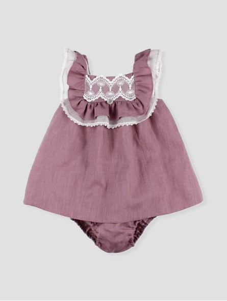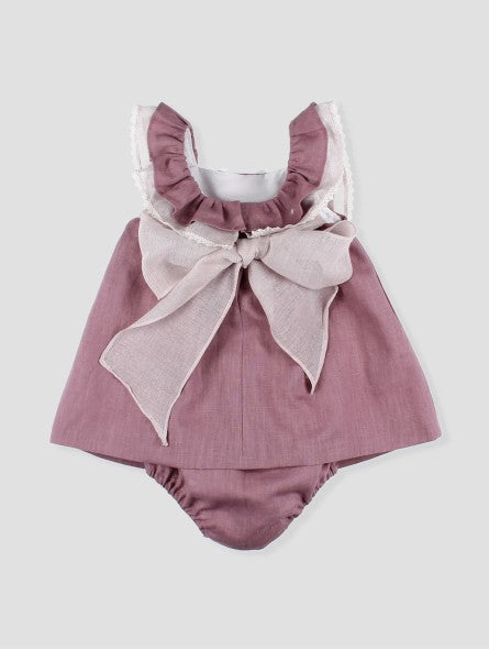 Jesusito para niña, en un elegante tono rosado, incluye vestido y braguita a juego. Destaca por su delicado volante en el pecho, decorado con encaje blanco, que realza el contraste con el color de la prenda. La espalda se embellece con un gran lazo de tejido ligero, aportando un toque distintivo. Confeccionado en suave tejido de lino, este diseño es cómodo y favorecedor, ideal para fiestas y celebraciones familiares. Hecho en España
