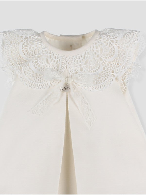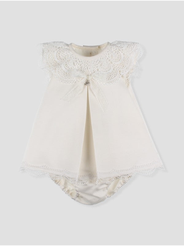 Este conjunto de bebé, compuesto por un vestido y braguita, destaca por la elegancia de su espalda con una apertura central decorada con fina puntilla ondulada. El cuello y las mangas lucen también encajes de inspiración floral que aportan un toque delicado y sofisticado. La línea de botones en la parte posterior combina estética y funcionalidad, facilitando el cambio de ropa. La braguita a juego asegura comodidad para los más pequeños. Perfecto para eventos especiales. Hecho en España