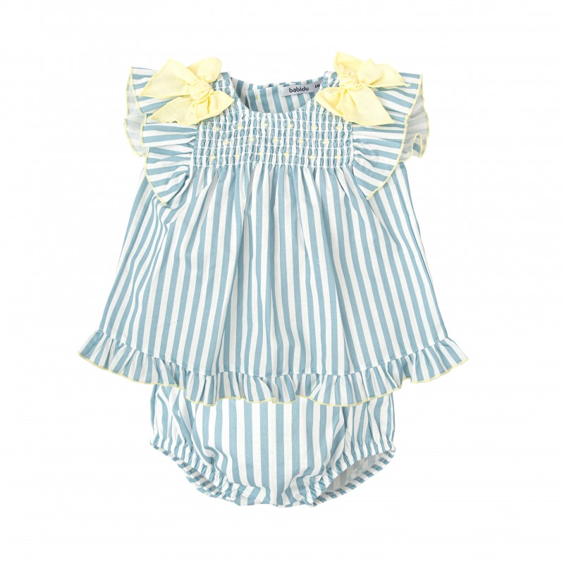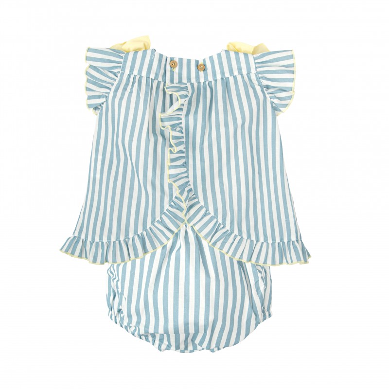 Jesusito de bebé con diseño de rayas verticales en tonos azul claro y blanco, acompañado de delicados lazos en color amarillo pastel que aportan un toque dulce y elegante. Su corte holgado y fresco es ideal para los días más cálidos.