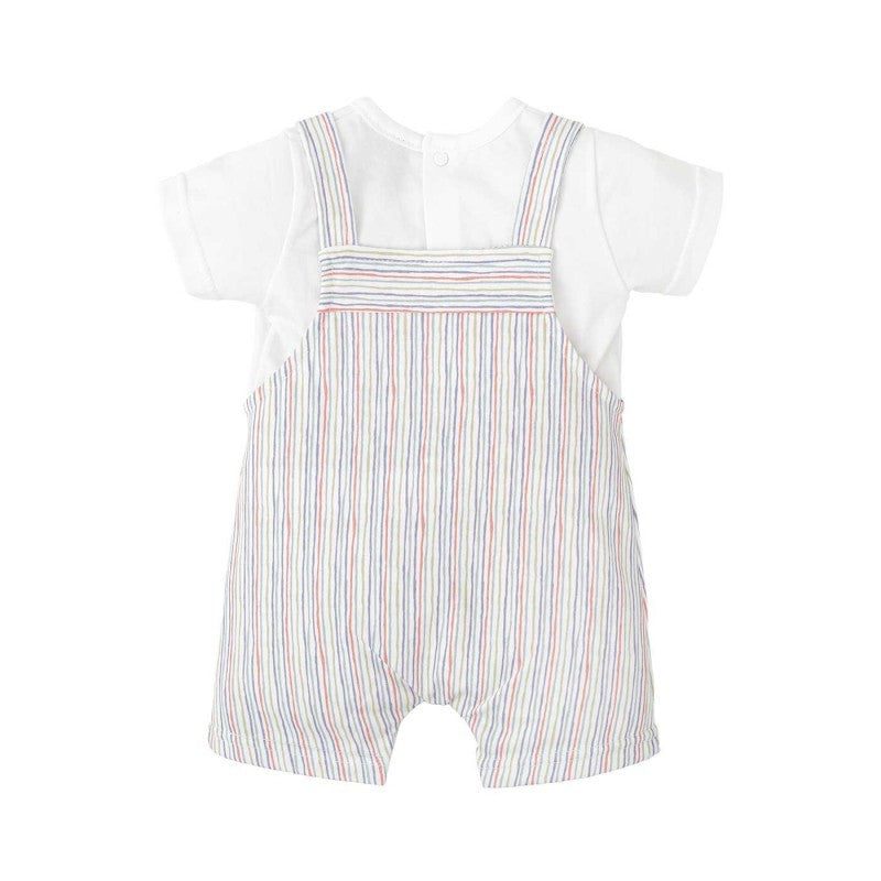 Conjunto ideal para los días de sol compuesto por una camiseta blanca de manga corta y un peto corto con tirantes y rayas multicolor. El peto incluye un práctico bolsillo central y botones de madera decorativos en los tirantes. Con cierre con corchetes en la entrepierna para facilitar el cambio, este conjunto une comodidad y estilo a la perfección.