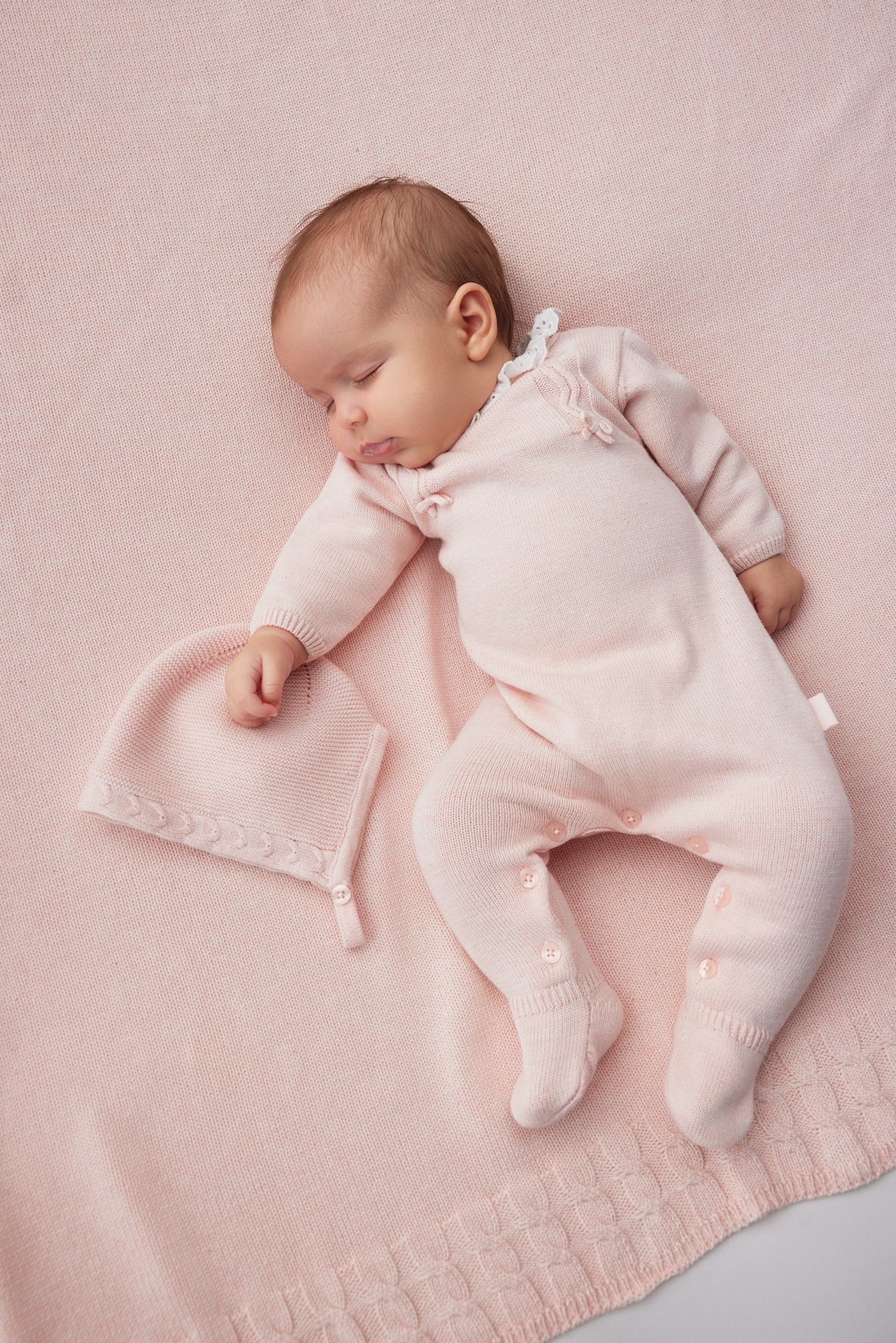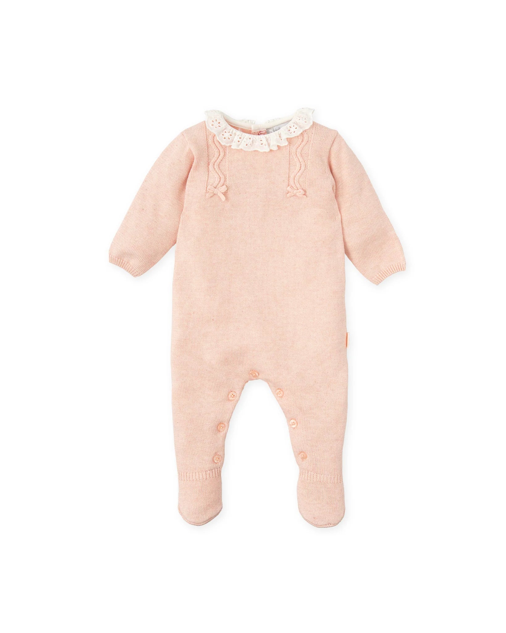 Pijama de bebe en color rosado palo con cuello redondo en color blanco, bordado con algodón