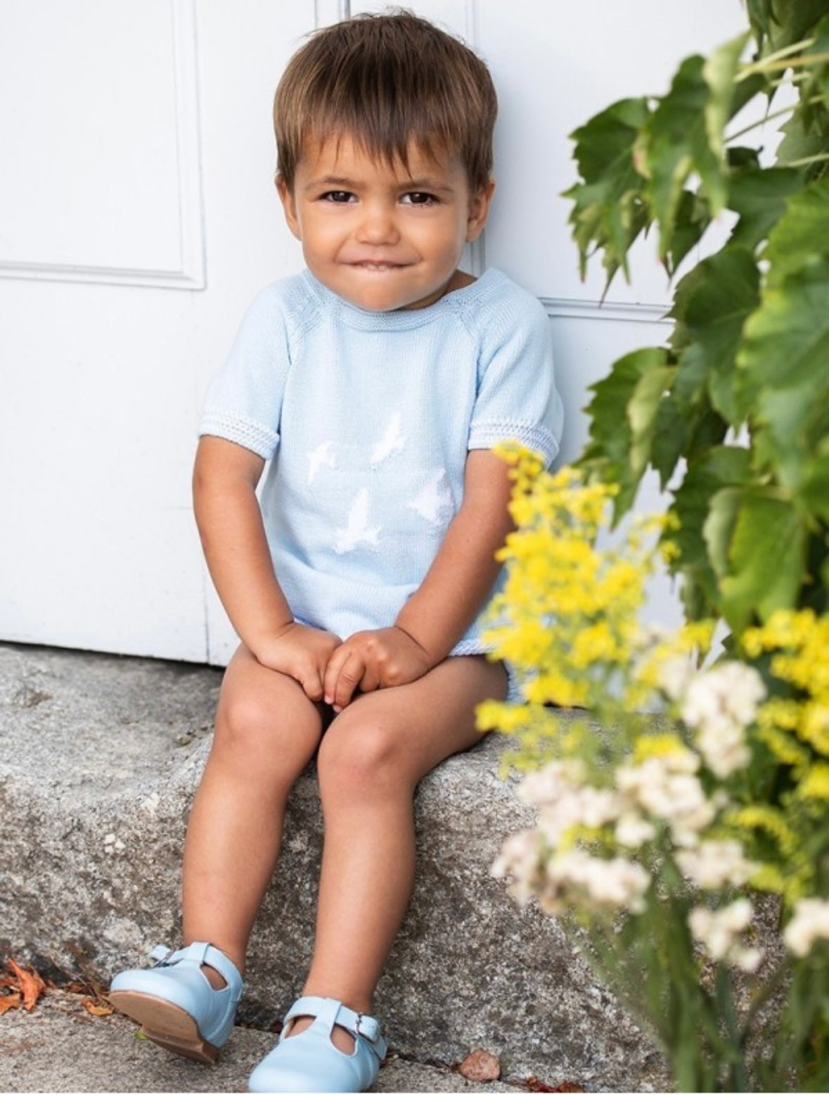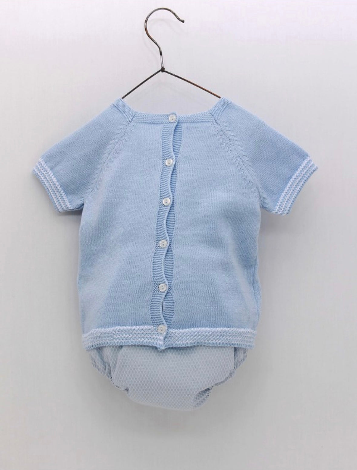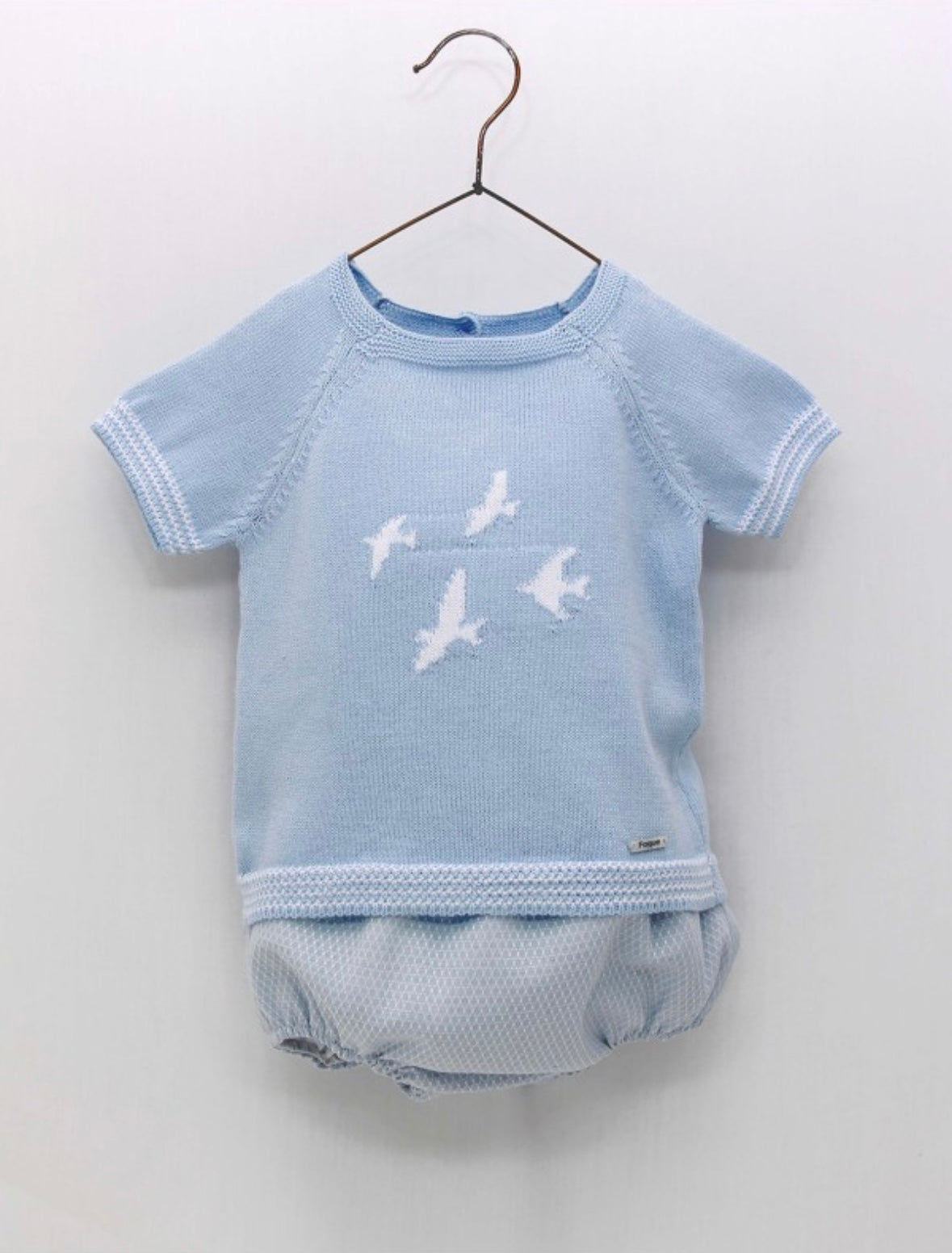 Trajecito bordado delicado de algodón con temática Aves, color celeste con short celeste de tela