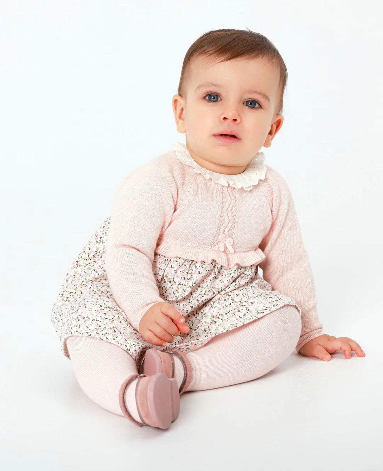 Encantador vestido combinado bordado y algodón, bordado en tonalidad rosada arriba manga larga y cuello blanco y la parte inferior estampado floral