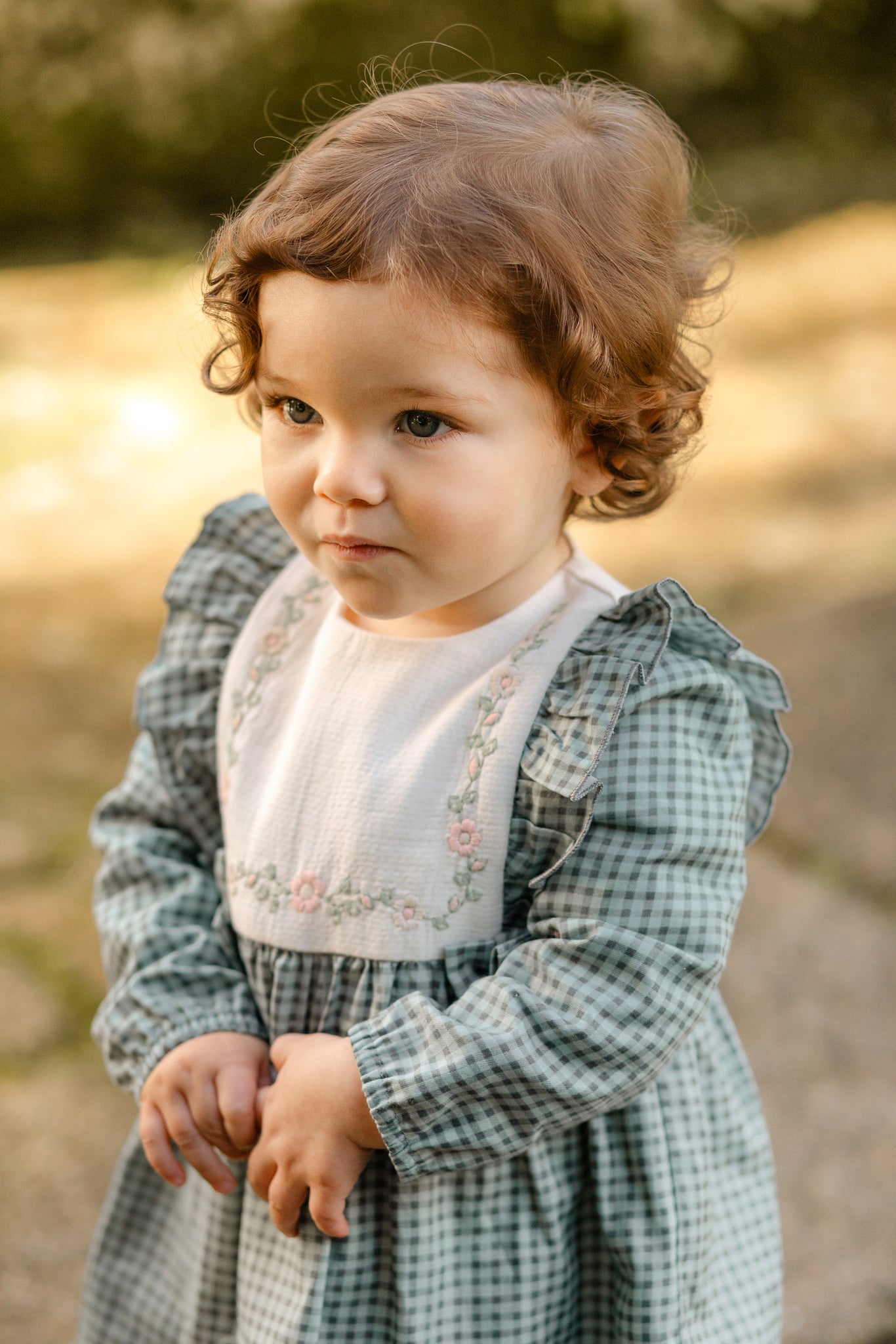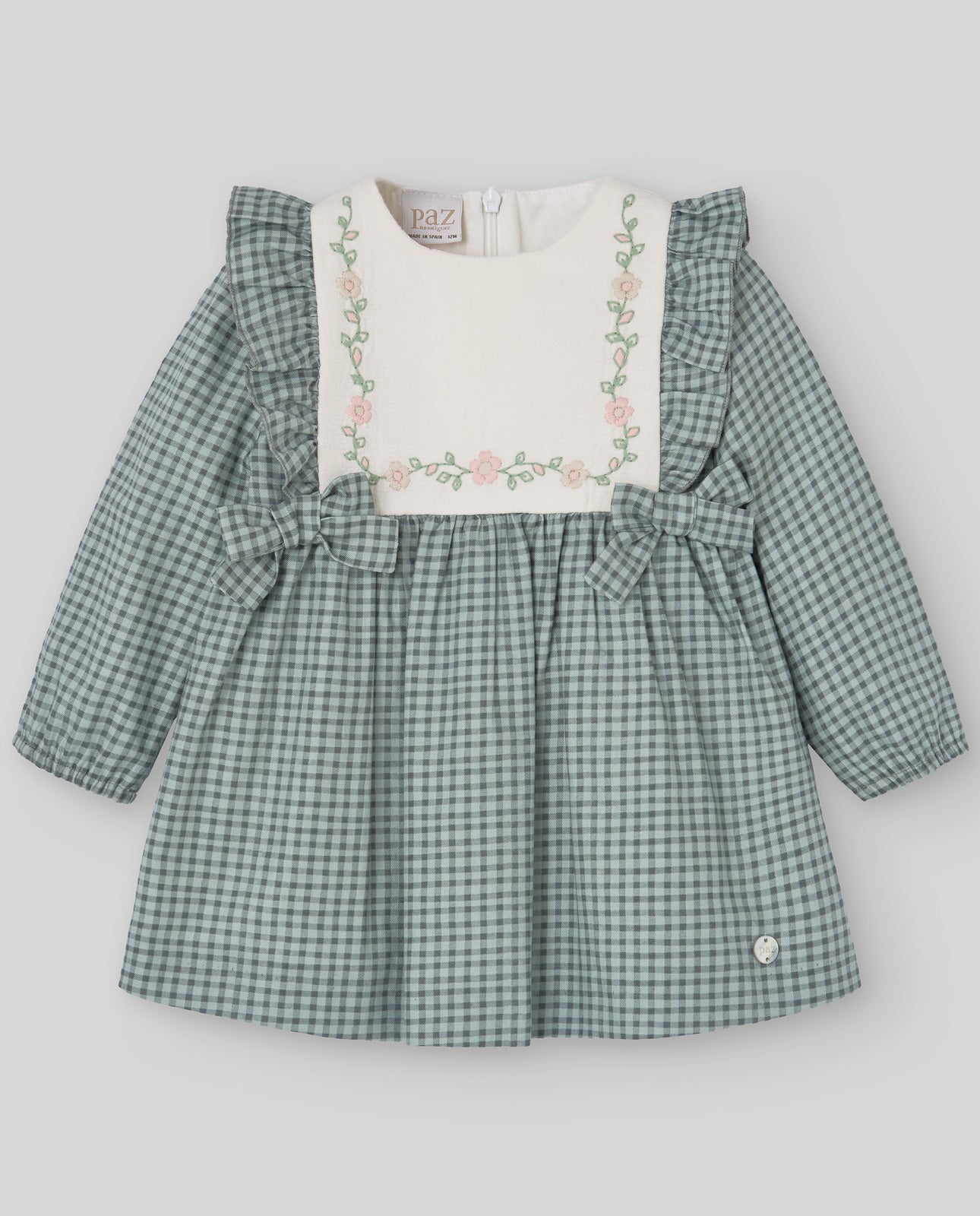 Vestido infantil estampado cuadros en tonalidad verde con toques florales bordados manga larga