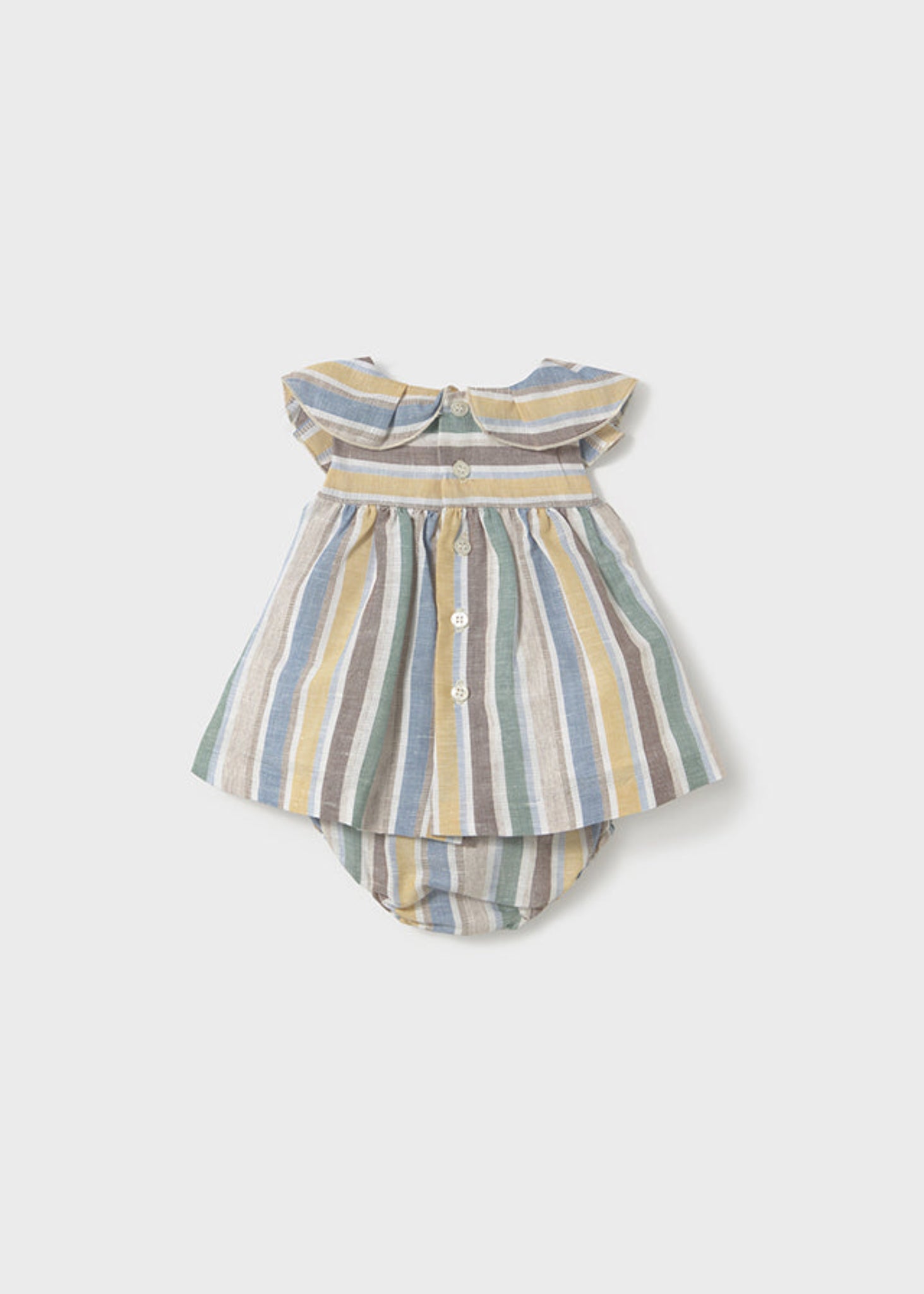 Vestido de lino con revuelos en la parte superior, rayas en tonaliddes verde sage, cafe, amarillo y celeste