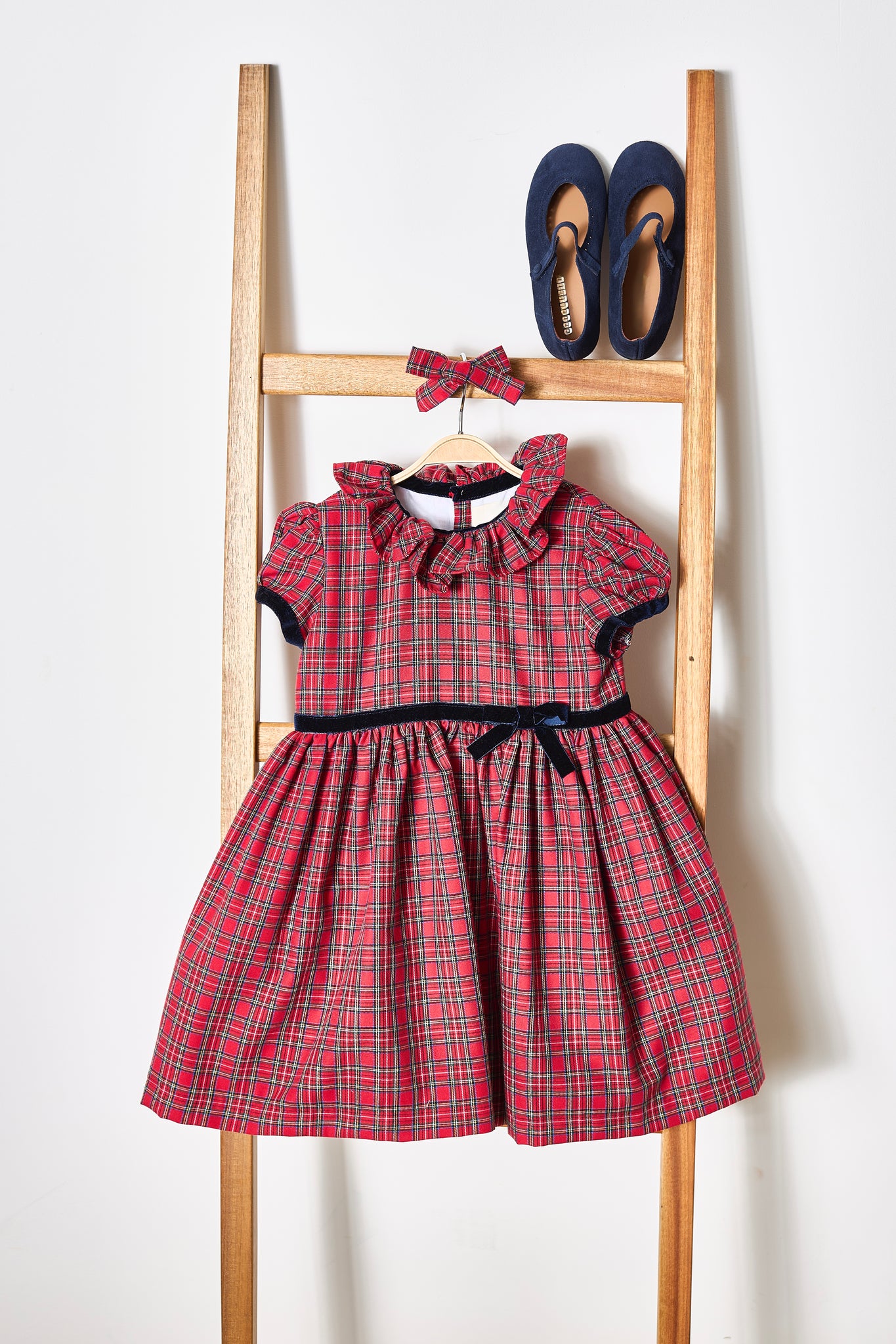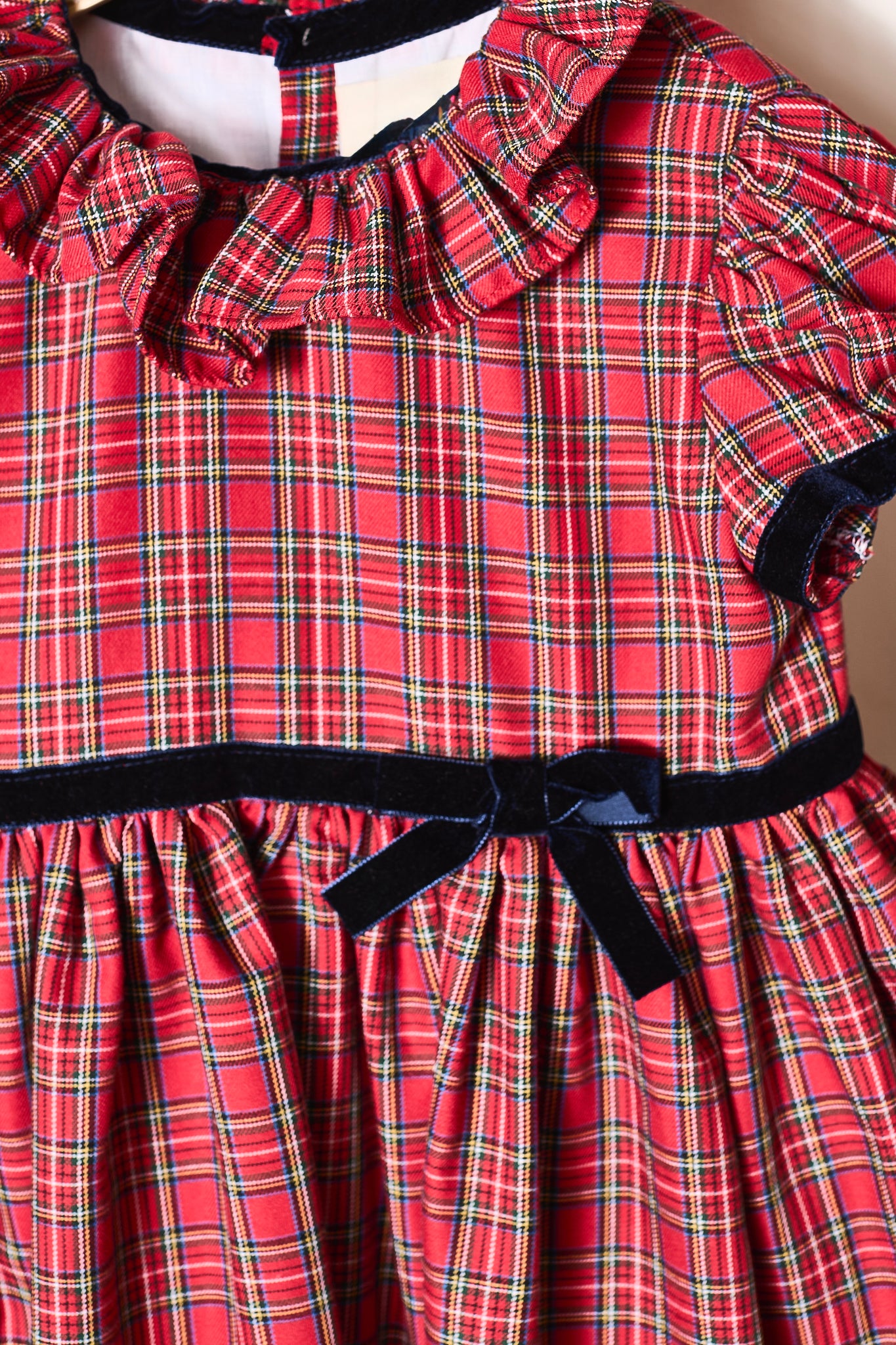 Vestido tradicional cuadriculado navideño en estampado tartan con toque de velvet en cinta color azul marino, cuello redondo con revuelos y manga cortas