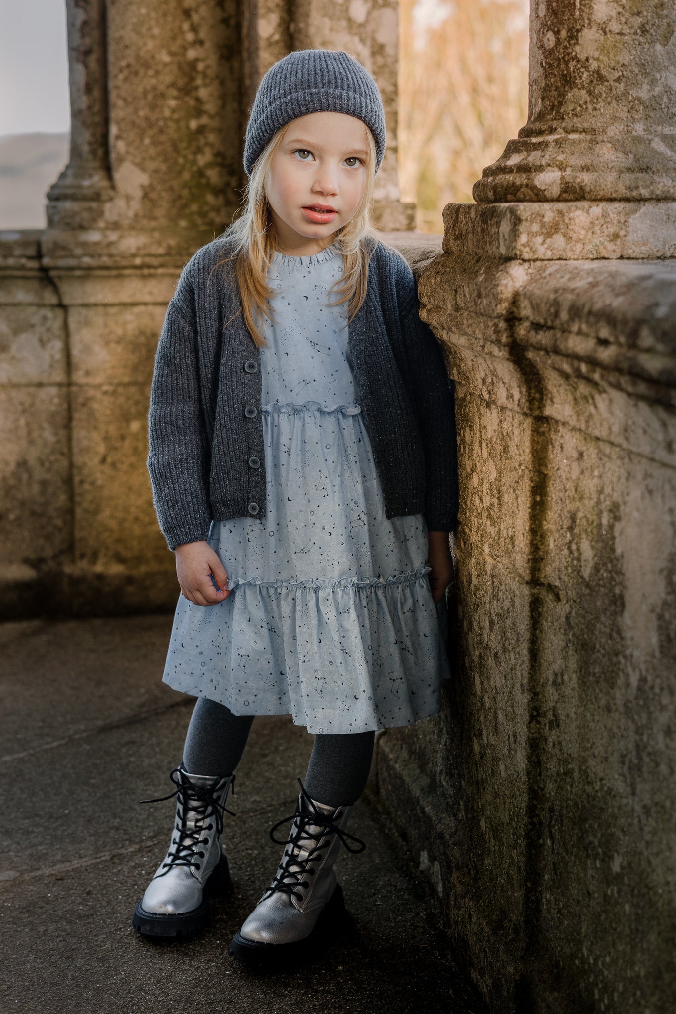 Este encantador vestido en tonalidad azul con maga larga de algodón tiene estampado de estrellas y astronomía delicada