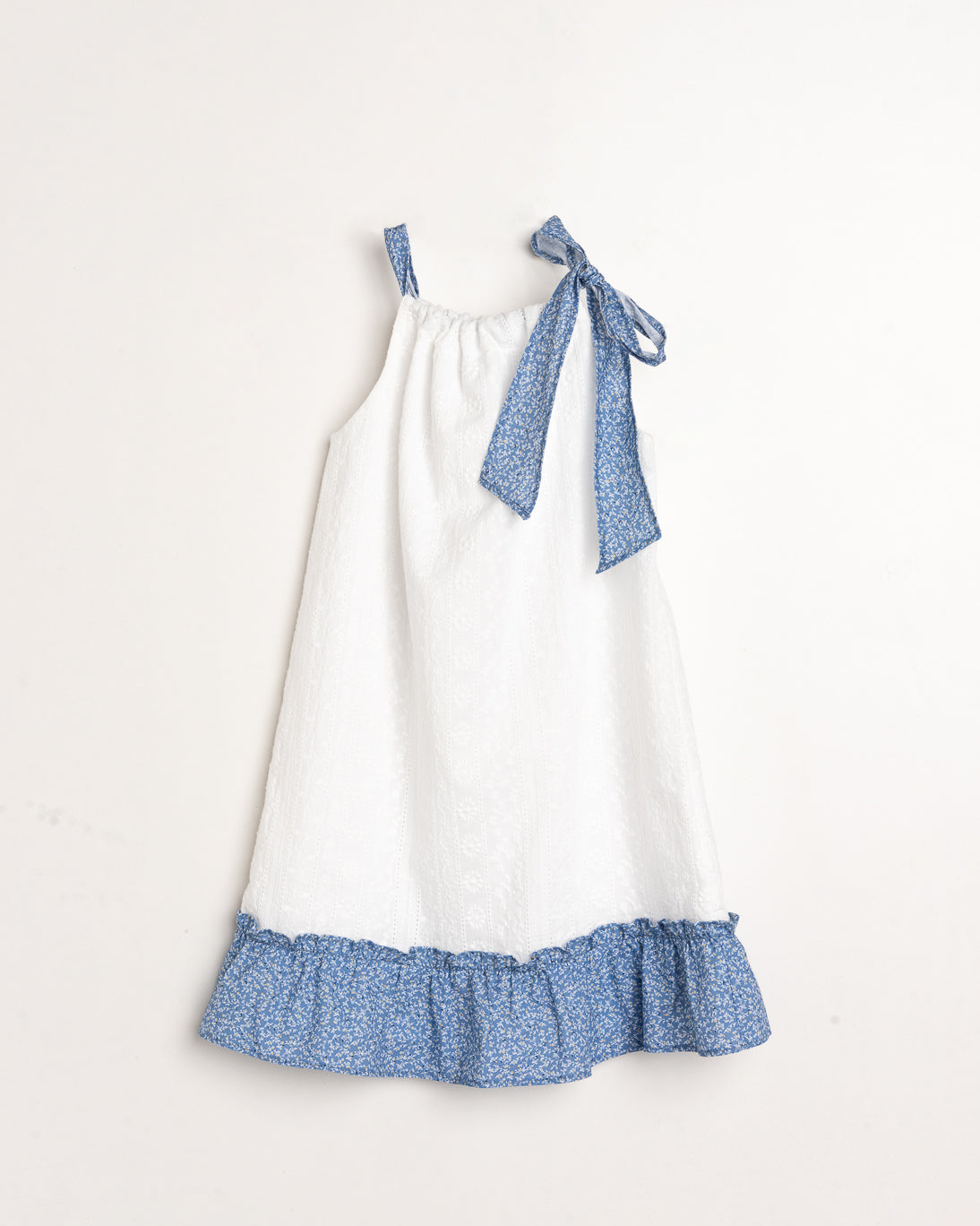 Un bello vestido fresco tonalidad blanca con la parte de abajo en un estampado floral azul, cuenta con un amarre del mismo estampado en la parte superior