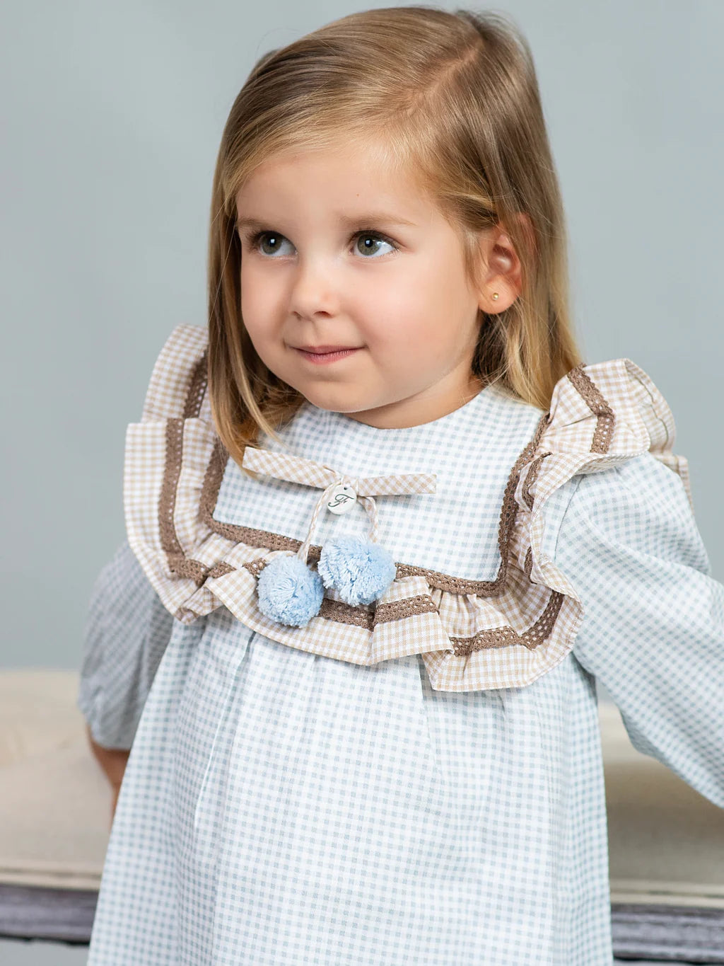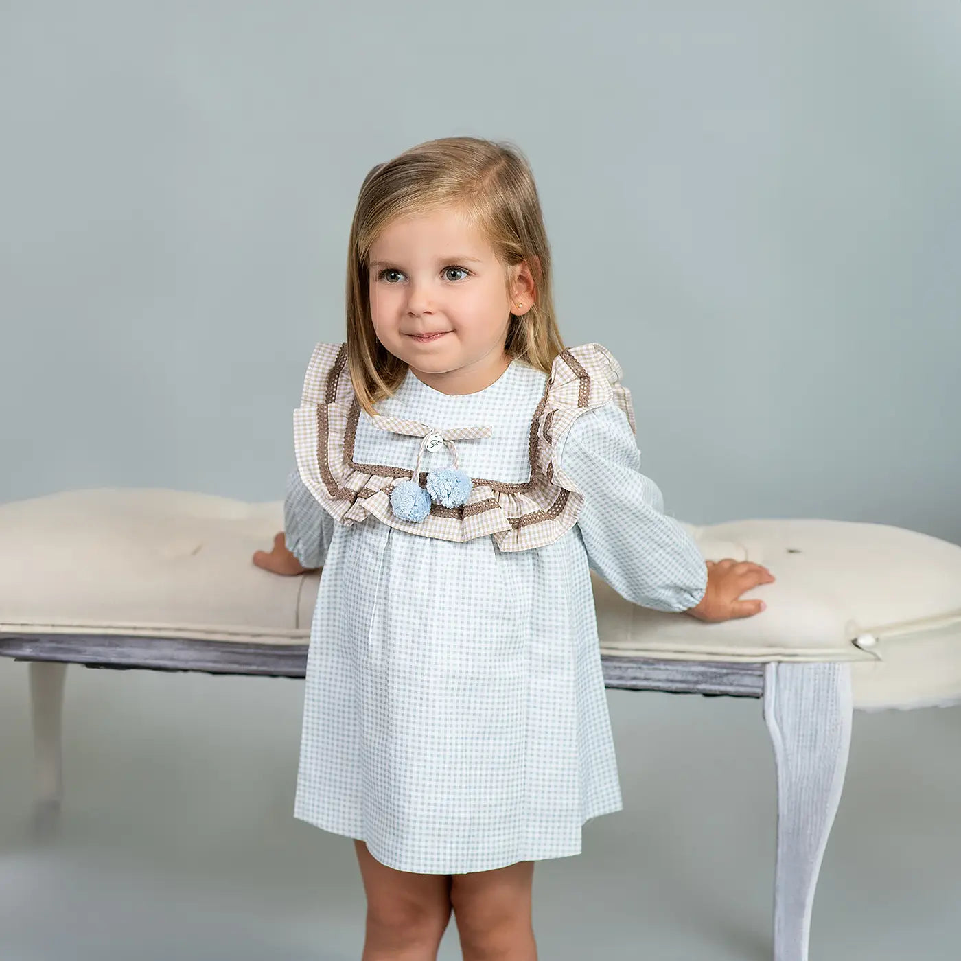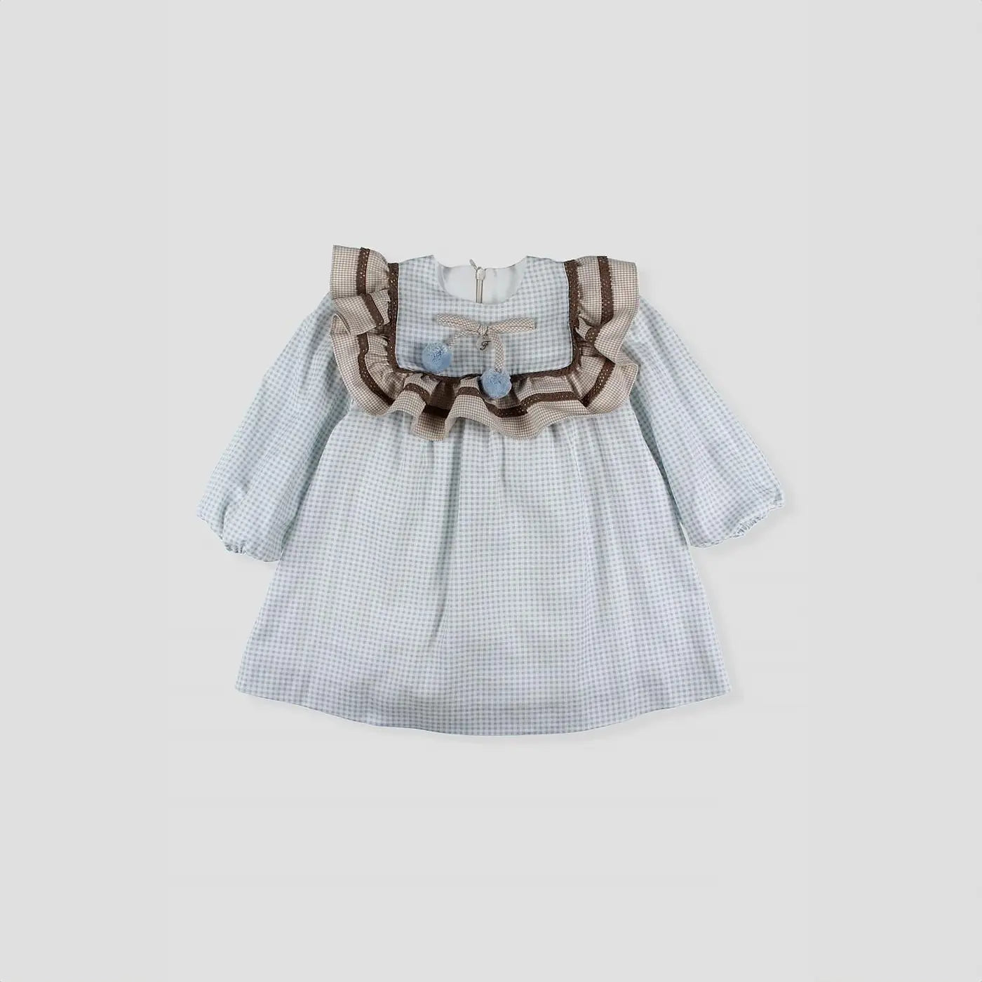Vestido manga larga en color azul celeste combinado con cafe claro con pom pom en la parte de enfrente y revuelos