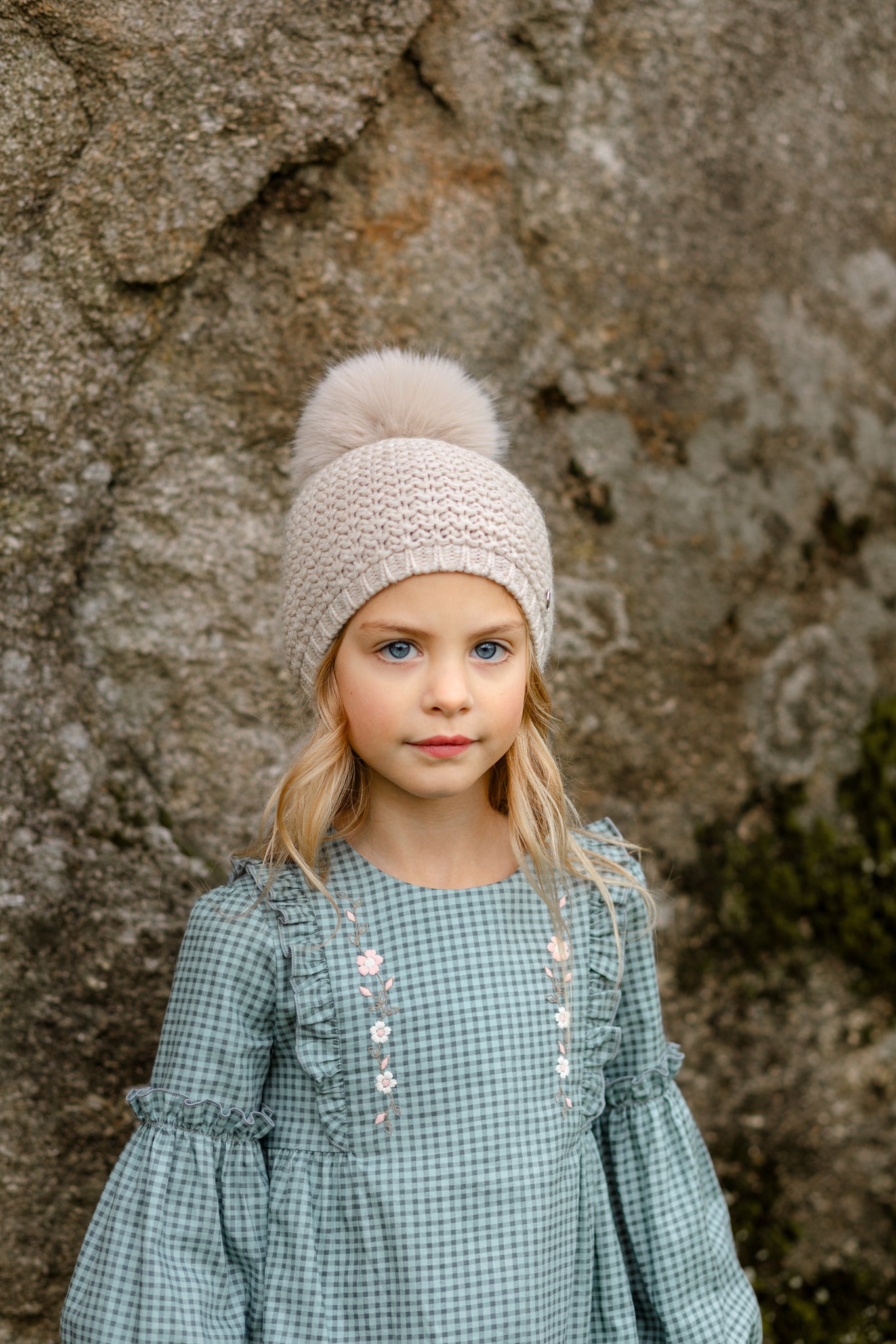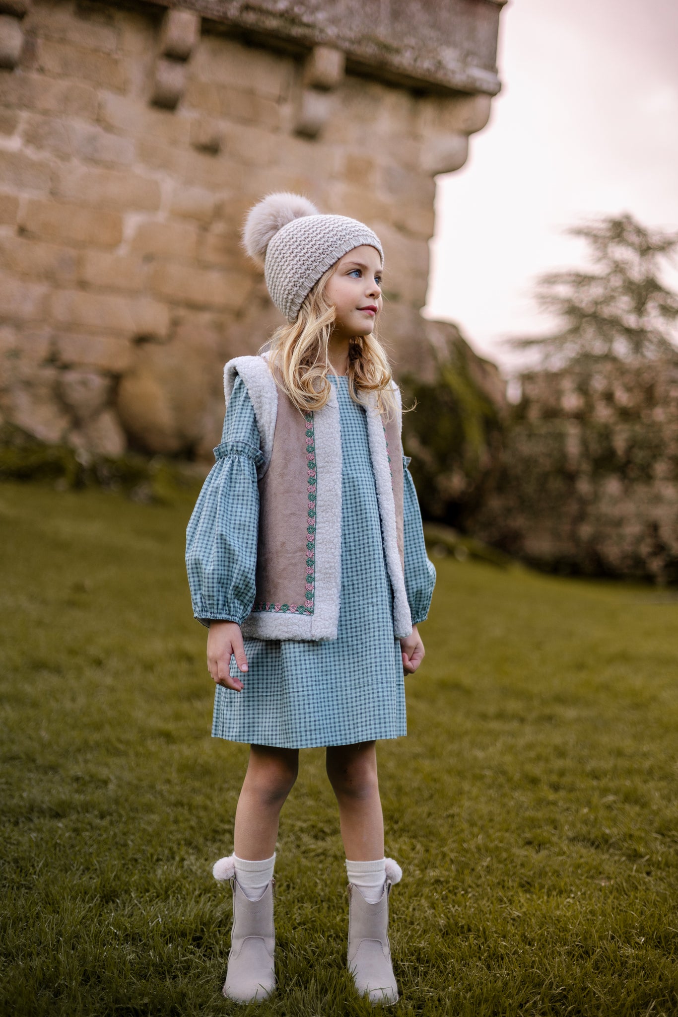 Vestido infantil estampado cuadros en tonalidad verde con toques florales bordados manga larga