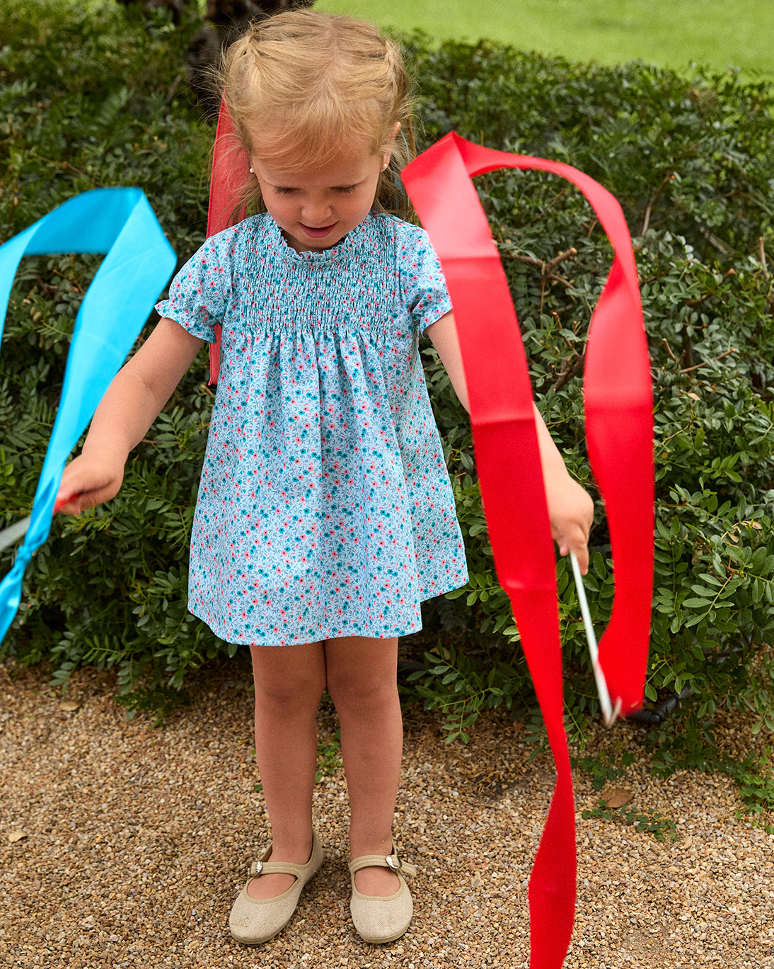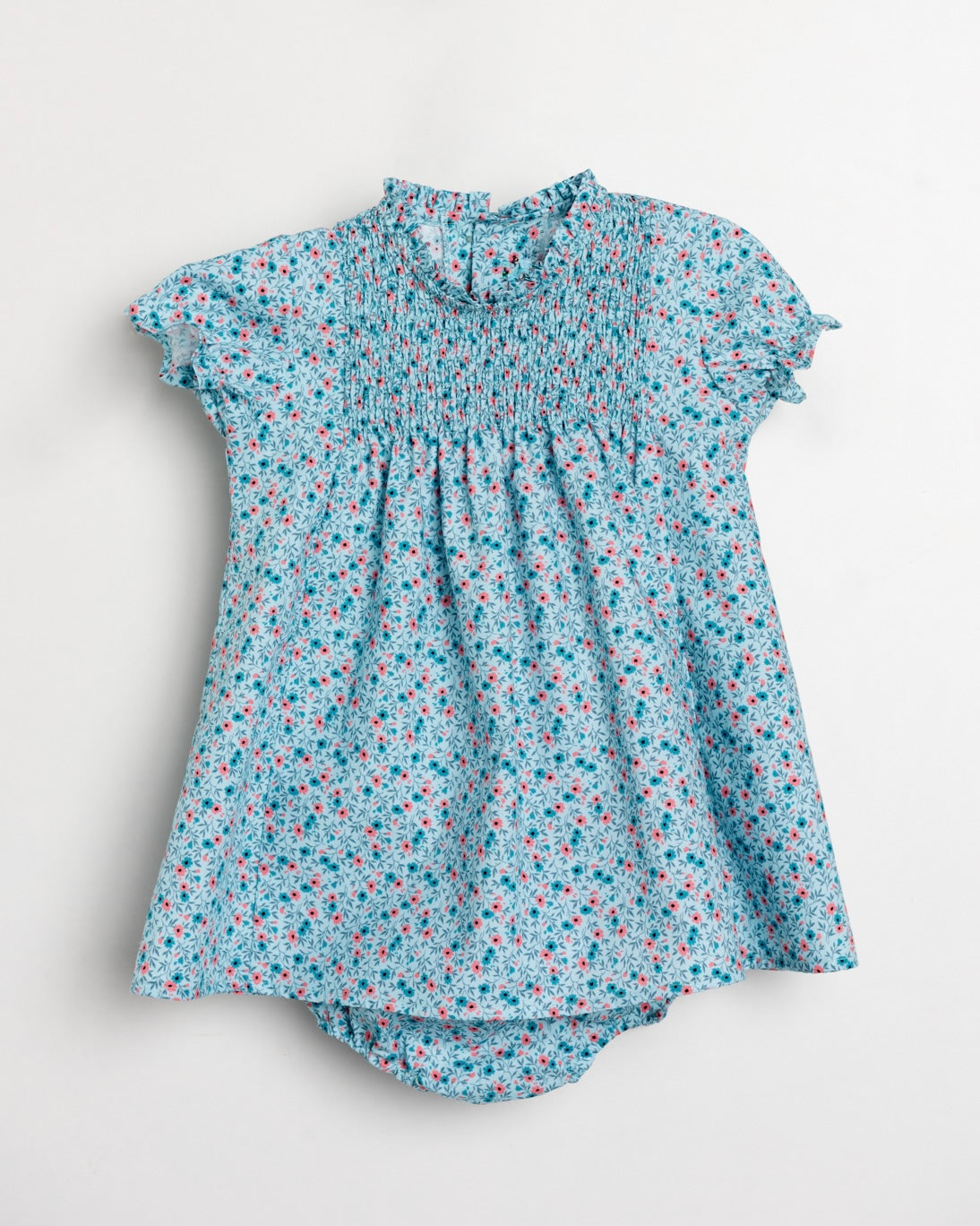 Vestido floral con fondo turquesa, realizado en tela liberty y manga corta con canesú en la parte superior