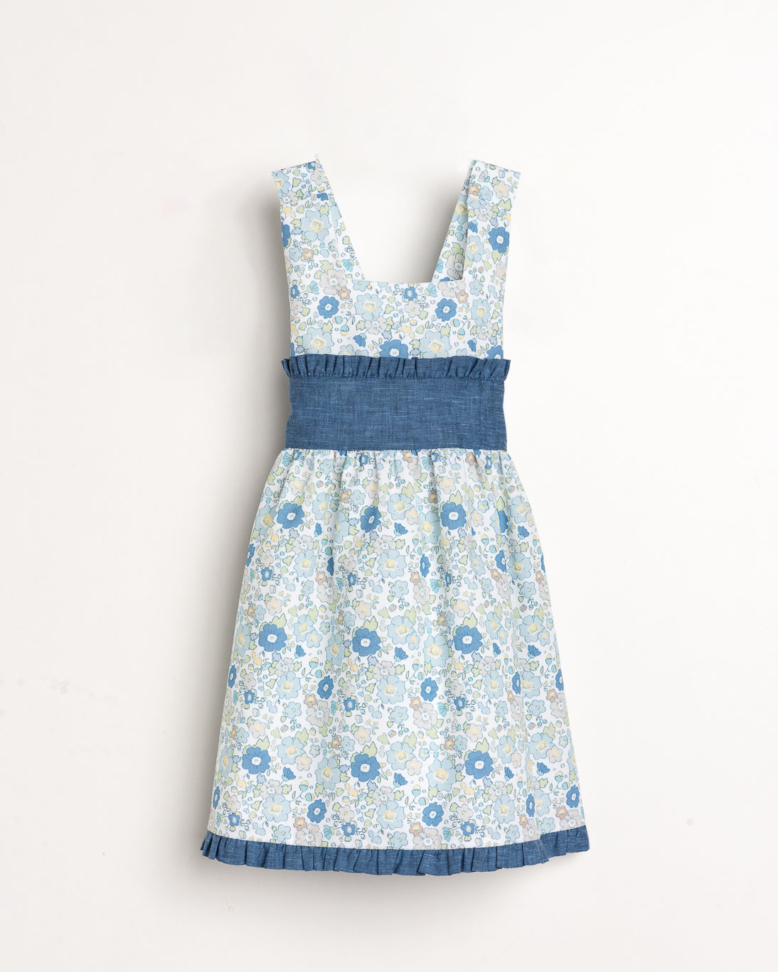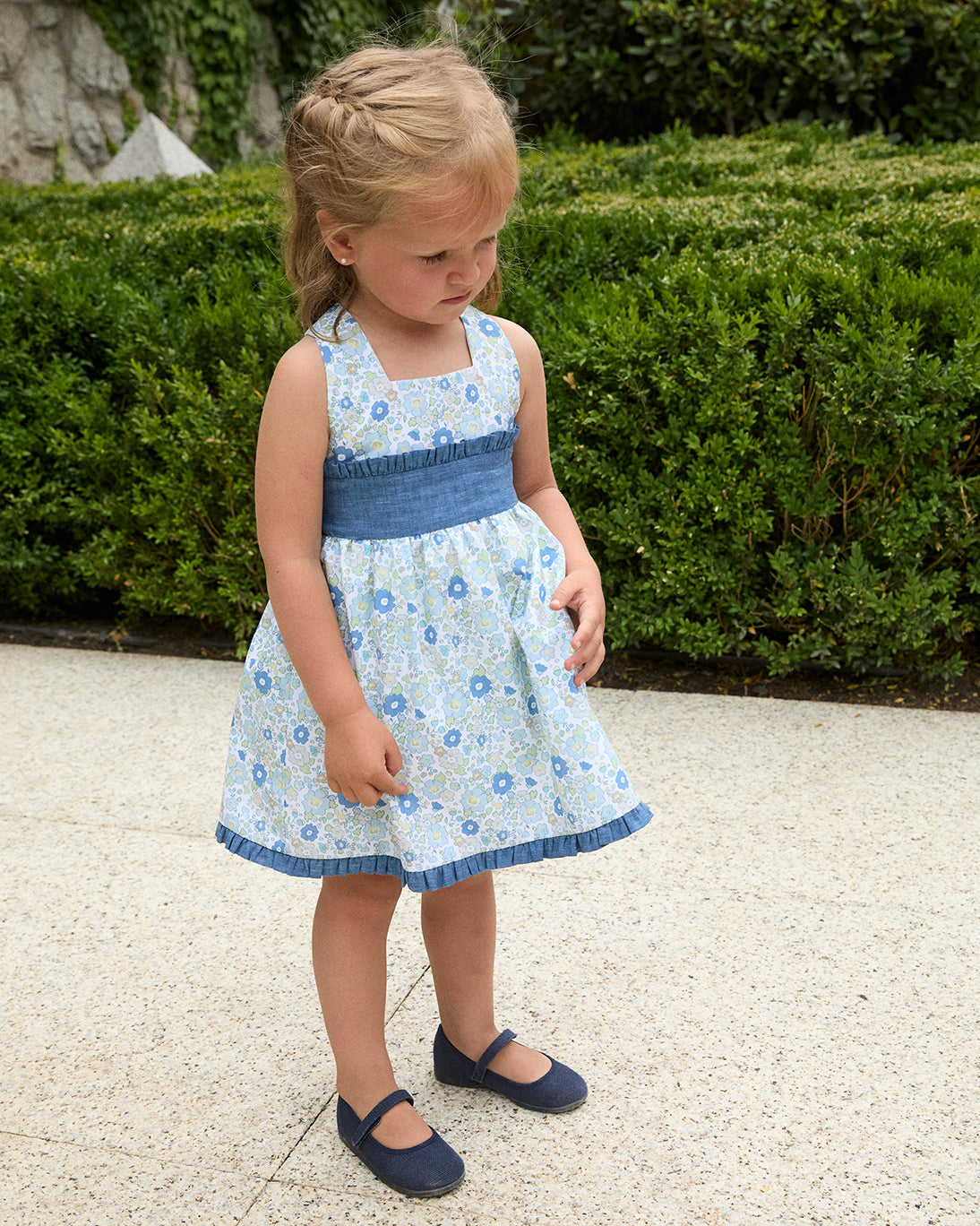 Bello vestido con estampado floral sin mangas y toques de jeans en la cintura, cuenta con cinturo de amarrar bello