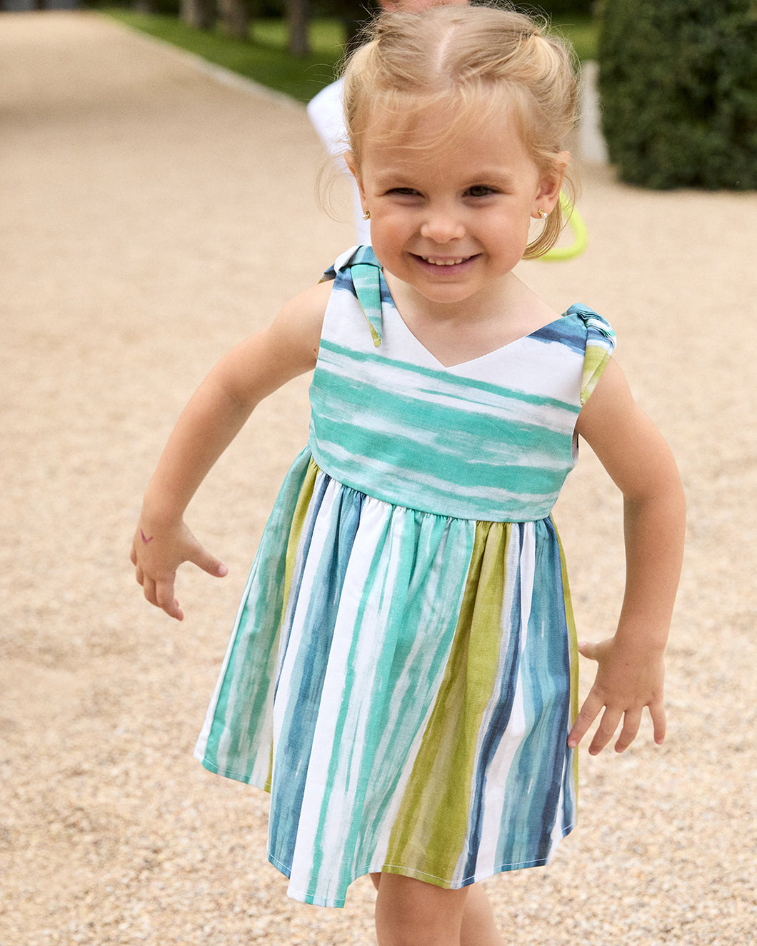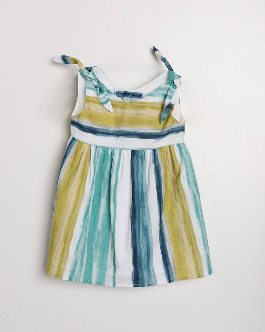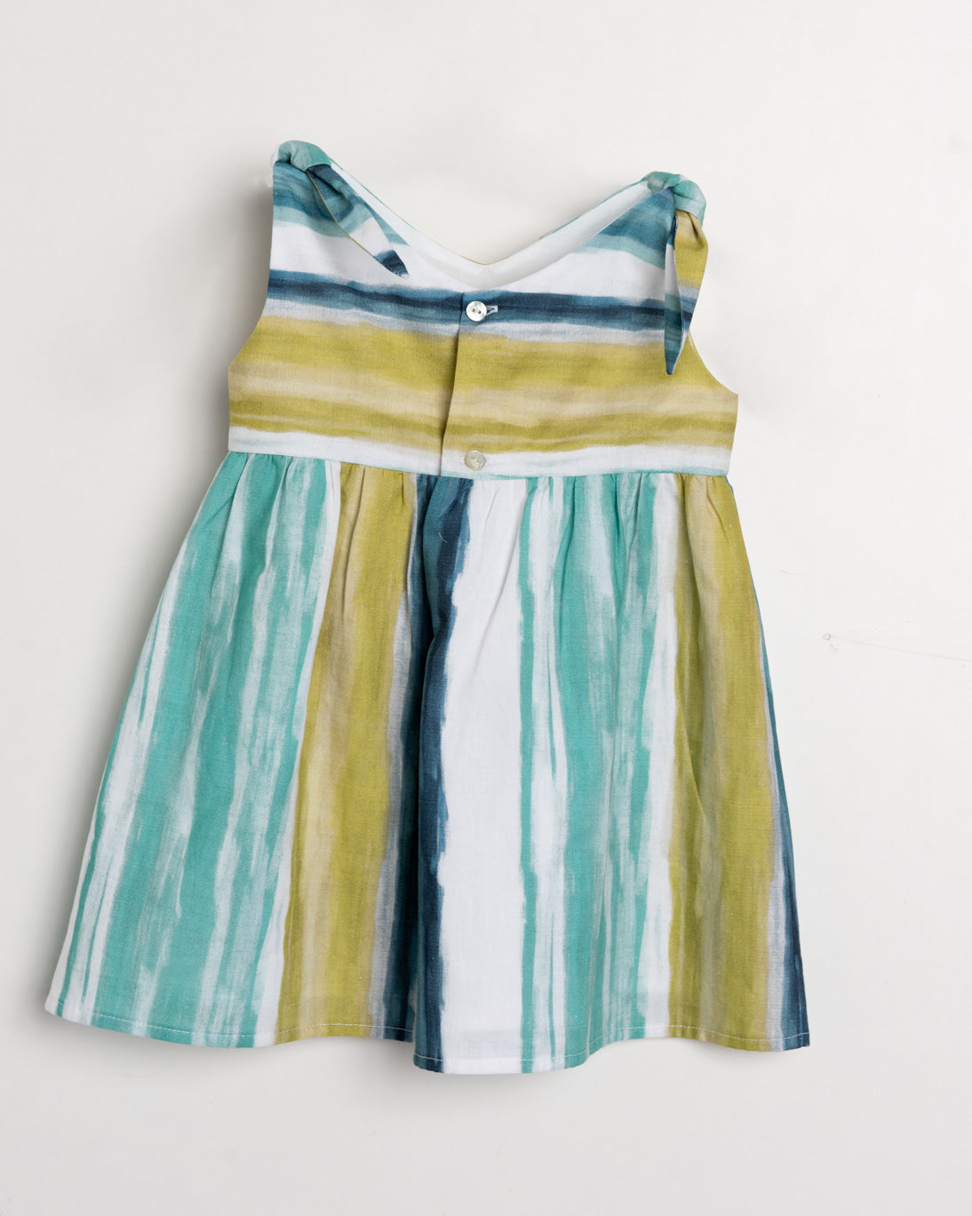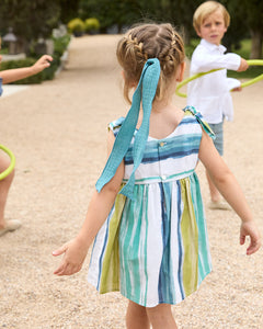 Un bello vestido fresco con detalles de amarre en las partes de arriba, estampado vibrante de color azul. Blanco, turquesa y verde