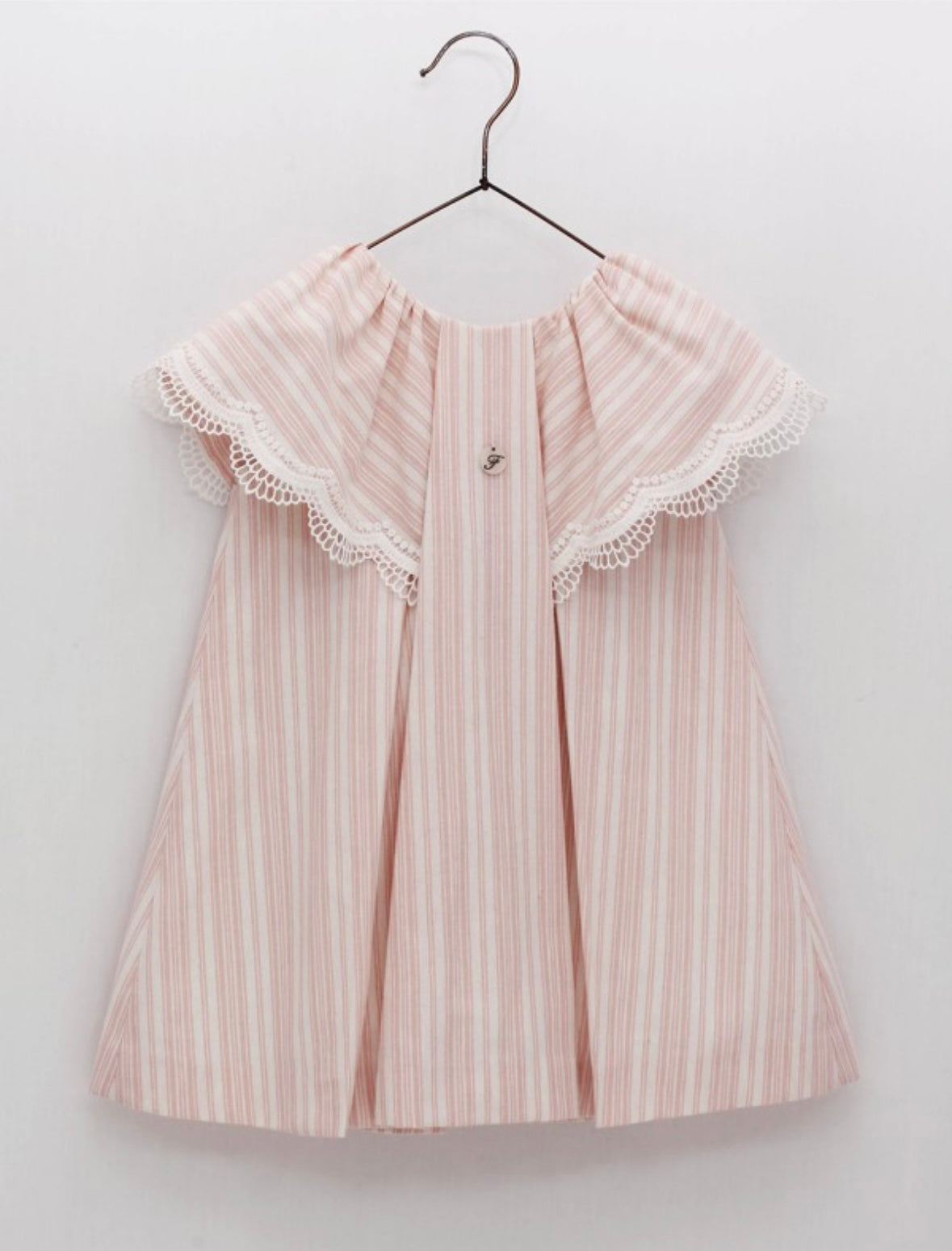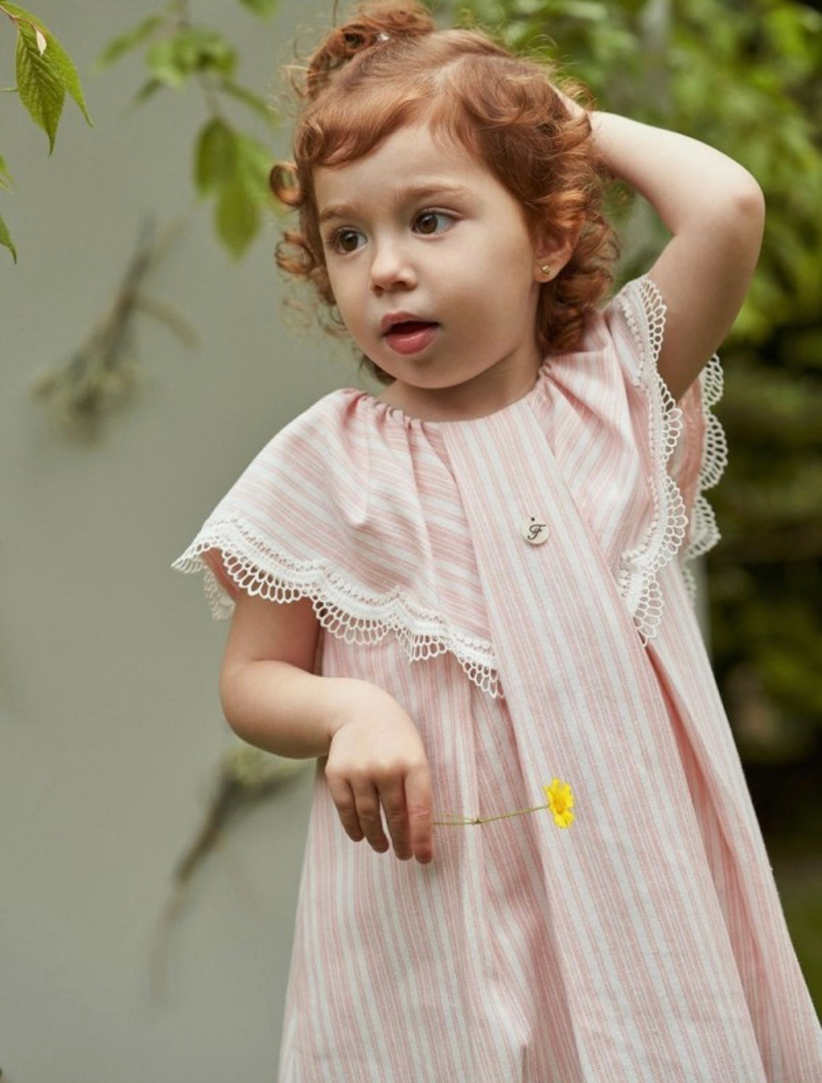 Vestido de niña con lineas blancas y fondo rosado colección Petra.