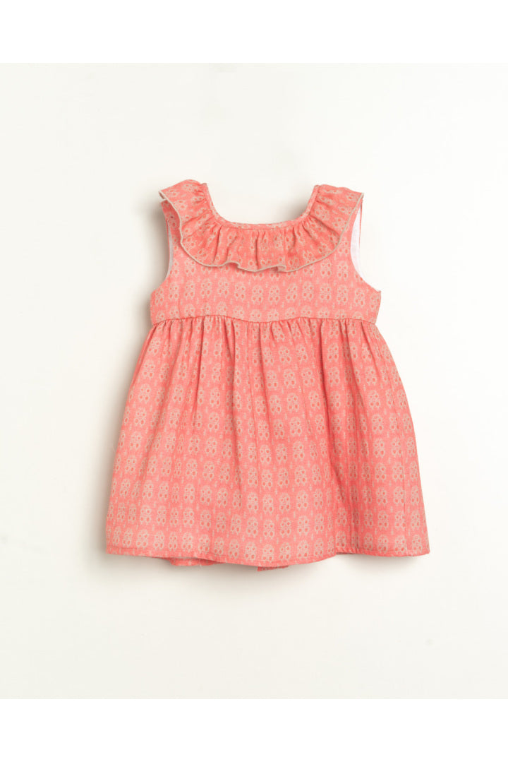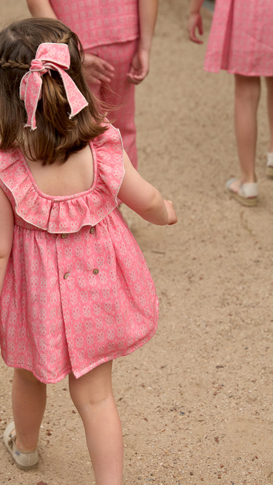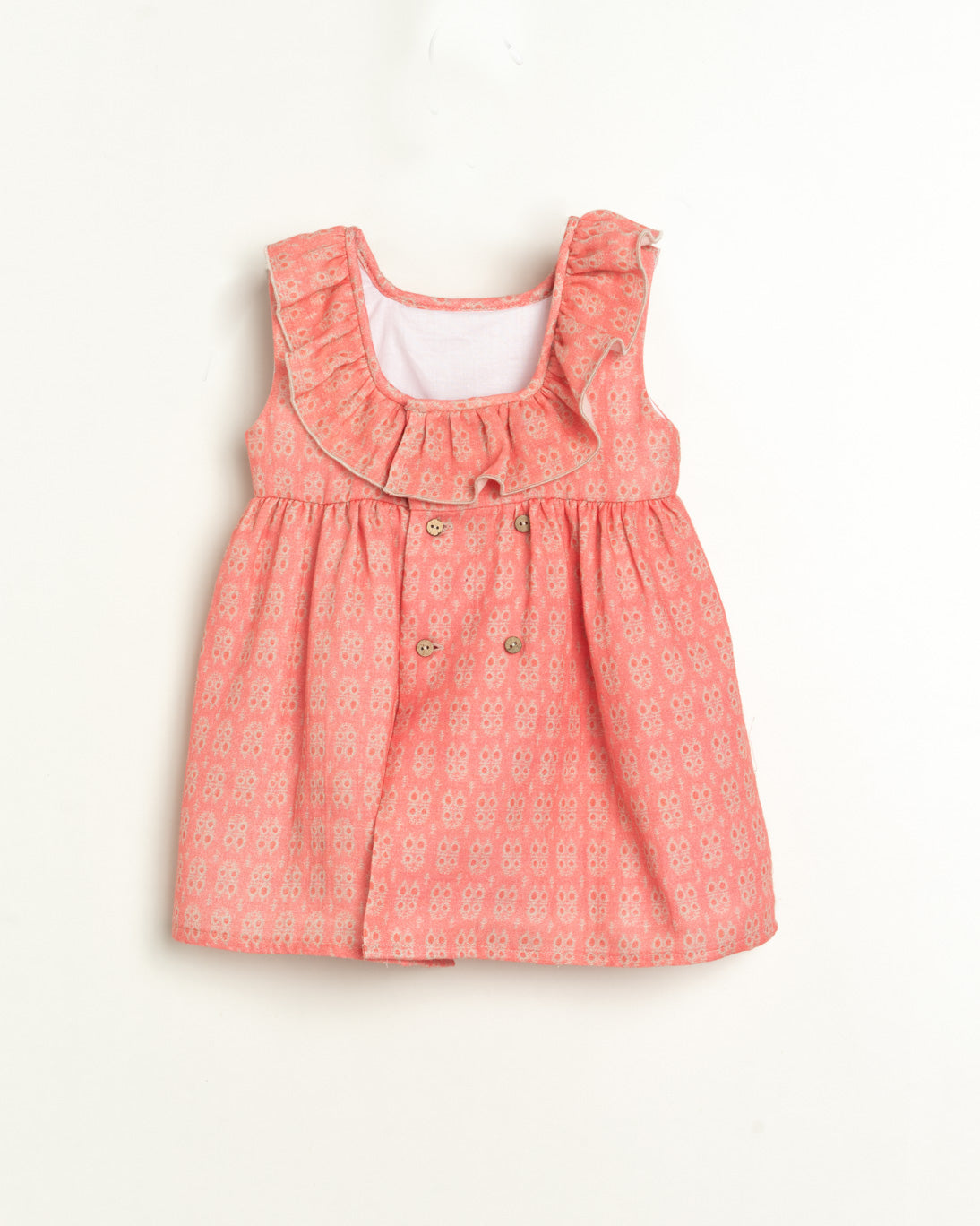 Vestido de niña en color salmon con cuello redondo con revuelos y en la parte de de atrás tiene un cuatro botones de madera con un revuelo delicado