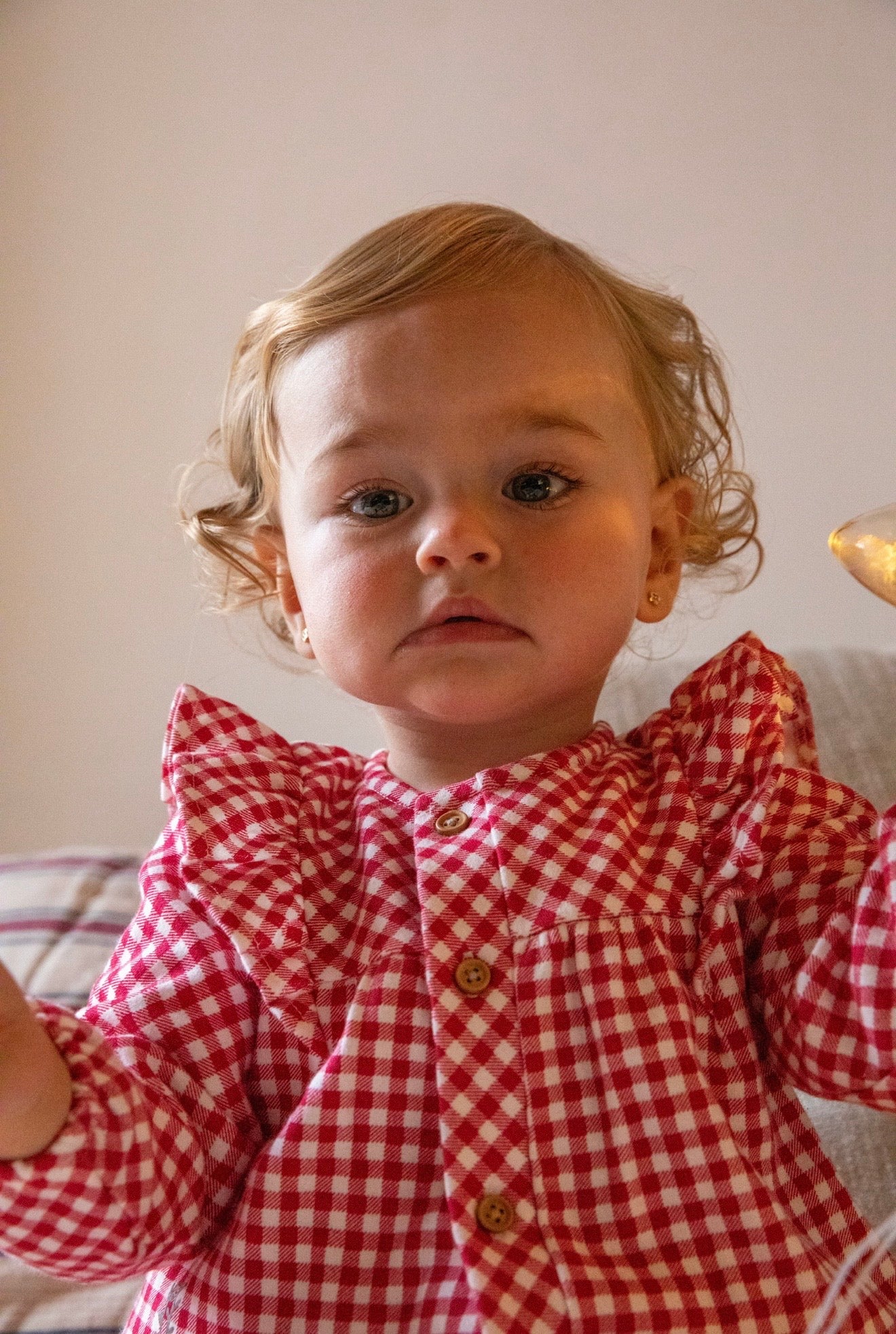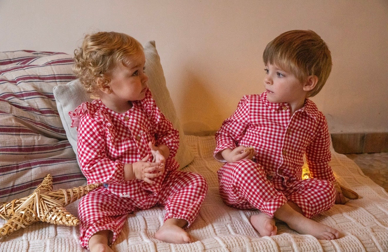 Pijama navideña de cuadritos roja set de camisa y pantalon camisa con revuelos y manga larga